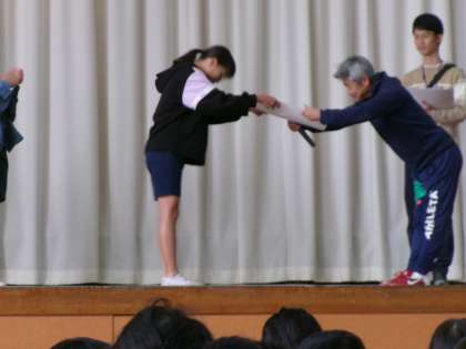 小学生陸上記録競技会で入賞した6年生がみんなに紹介されました。
