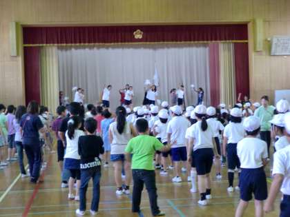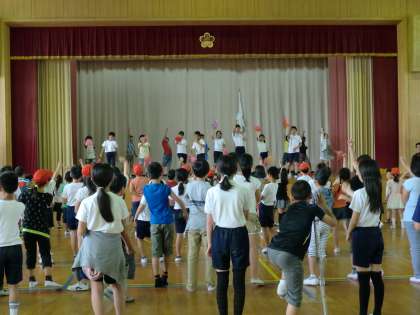 休み時間を使って,応援練習をしています。今日は,中間休みに白組,昼休みには赤組が,体育館に集まって練習しました。「声を出してくださ〜い。」「応援団がこうしたら,手を上げてください。」と,応援団が指示を出します。当日まで,声も心も合わせられるように,もう少し練習が必要です。