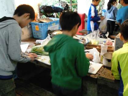 昼ごはんは豚じるを作りました。2回目の野外調理ということで,それぞれの係の仕事も手際よく進んでいました。材料を切って,お米を洗って…。