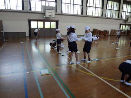 まず,二人組で体のいろいろな部分を使った握手をして,準備運動にあててています。手で握手をしたり,つまさきで握手をしたり,背中を合わせて握手をしたりします。子ども達は楽しそうに握手をしています。これをすると,なごやかな雰囲気になります。