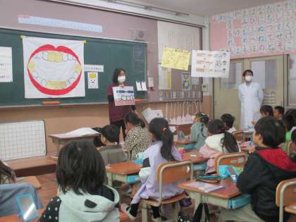12日、歯科衛生士さんと学校医の保先生に、正しい歯のみがき方を教えてもらいました。歯みがき練習の前に、まずはお話を聞きました。1年生は生え変わりの時期と重なり、特に磨きにくいようです。