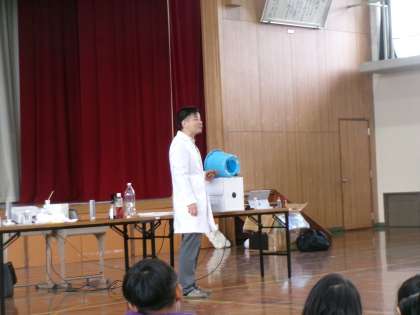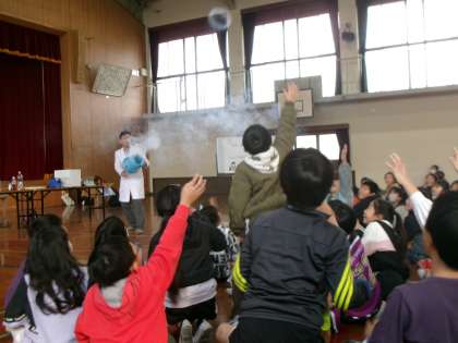 もっと大きな空気のわっかを作りたいよね〜 登場したのはバケツです。そこにあけてある大きな穴に子供たちは大喜び!