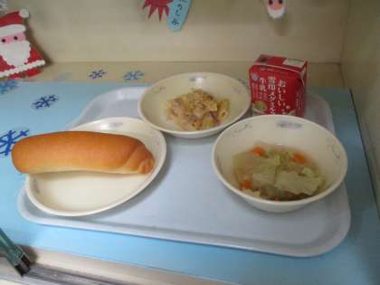 今日の給食は牛乳 コッペパン ペンネの豆乳グラタン 野菜のスープ煮でした。