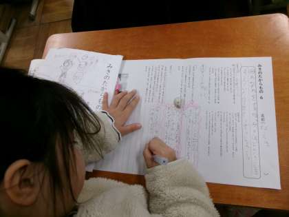 「ナニヌネノン」とお別れをする時の「みき」の気持ちを想像して読む学習活動でした。文章を読んで考えたことをワークシートに書き込んでいます。集中して頑張る2年生!素敵です。