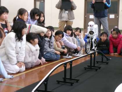 開発の苦労の話を聞いている子ども達はロボットの様々な動きに驚き,目を輝かせていました。