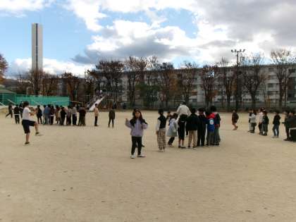 昼休みの校庭です。元気いっぱいに大縄跳びを練習しています。ジャンプアップ・大繩大会に向けて練習をしているようです。頑張ってね。