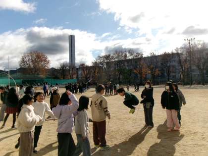 冬晴れの良い天気の下で中間休みも昼休みも練習です。高学年も低学年もみんな元気いっぱいです。
