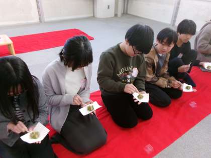 まずはお菓子をいただきます。季節を感じるお菓子のいただき方にも作法があり,子ども達は教えられたことを意識し,ちょっぴり緊張しながらおいしくお菓子をいただきました。