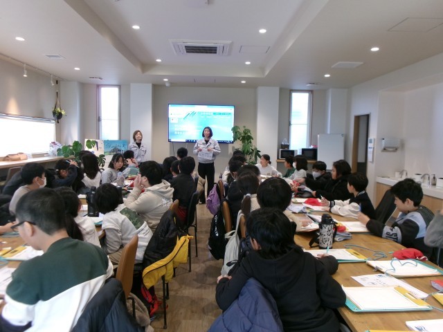 工場から事務所に場所を変えて会社の説明を聞かせていただきました。入るととてもいい匂い!アロマをたいて気持ちよく仕事ができるようにしているのだそうです。お話を聞かせていただいた社員食堂もカフェのような雰囲気で子ども達はまたまたびっくり!ここでも熱心にメモを取っていました。