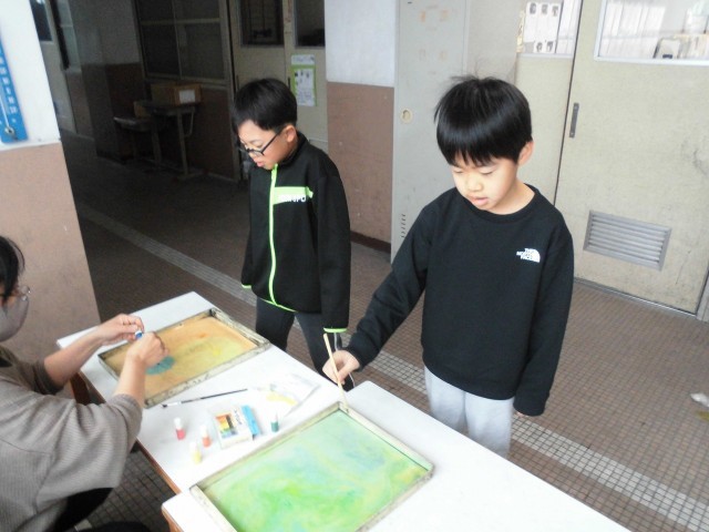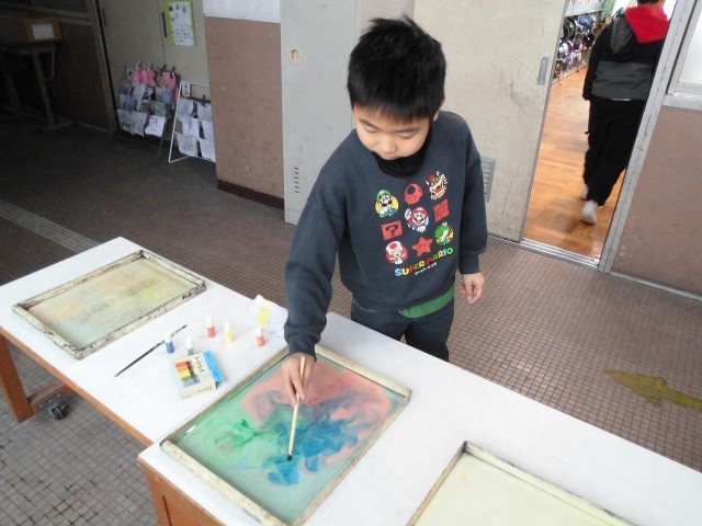 マーブリングで和紙にもようをつけました。自分で選んだ色を筆で混ぜ、自分だけの模様が完成しました。