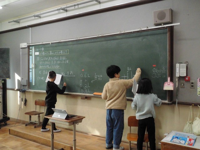 算数の学習では、小数のたし算の計算の仕方をノートに説明したり、友だちに説明したりしました。