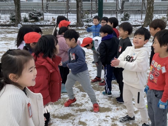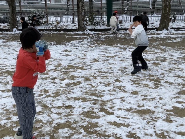運動場に雪が積もったので、みんなで雪合戦をしました。