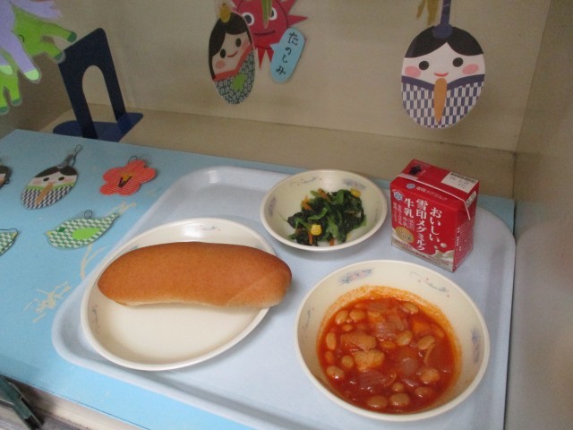 今日の給食は 牛乳 全粒粉パン 大豆と鶏肉のトマト煮 小松菜のソテーでした。