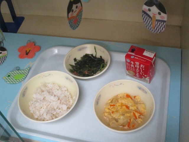 今日の給食は 牛乳 麦ごはん 高野どうふの卵とじ ほうれん草のおかか煮 でした。
