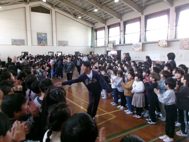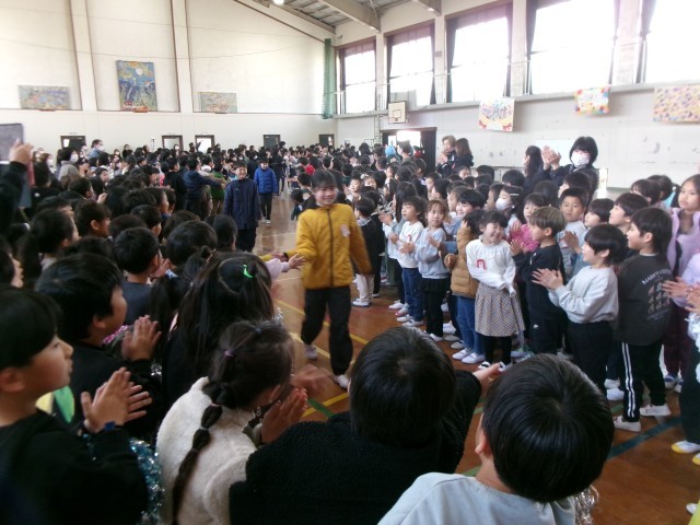 全校児童、教職員、6年生の保護者の方々の温かい拍手に迎えられてちょっぴり照れながら、嬉しそうな笑顔で入場です!