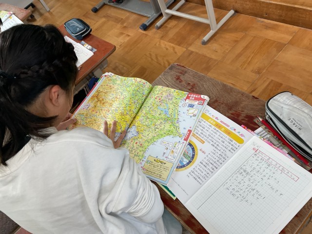 社会では、地図帳で場所の表し方の学習を行い、記号を使って場所を表すことができるようになりました。