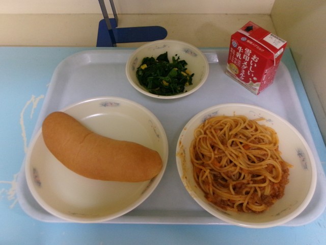 4/15 今日の献立は小型コッペパン、牛乳、スパゲティのミートソース煮、ほうれん草のソテーでした。