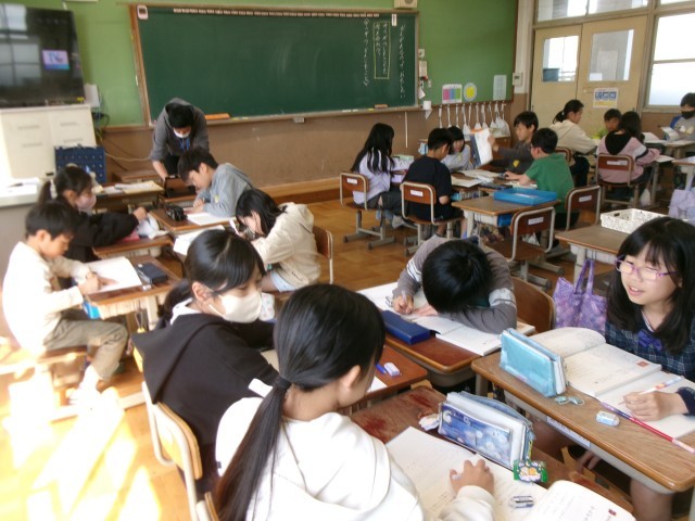 国技の学習をしています。早速グループで自分の考えを伝え合っていました。