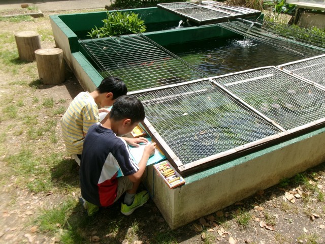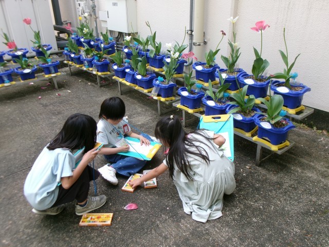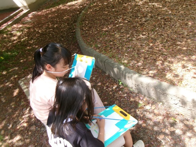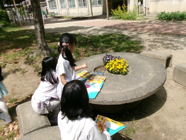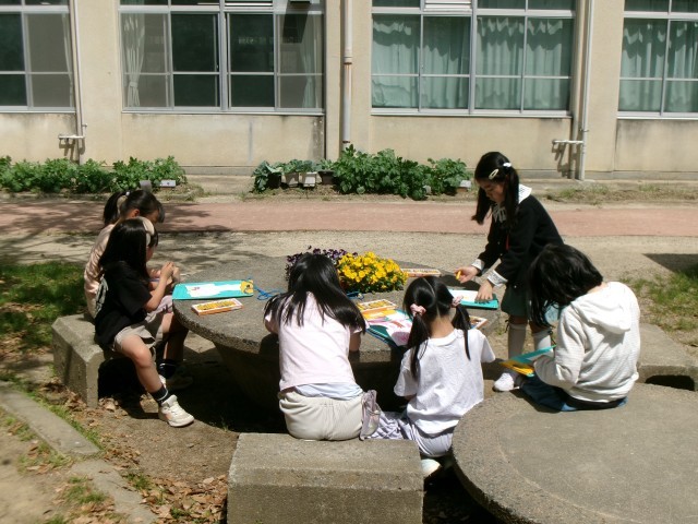 春の日差しの下、2年生が中庭で熱心にカードに絵をかいていました。じっくり見て、丁寧に色を塗っていました。