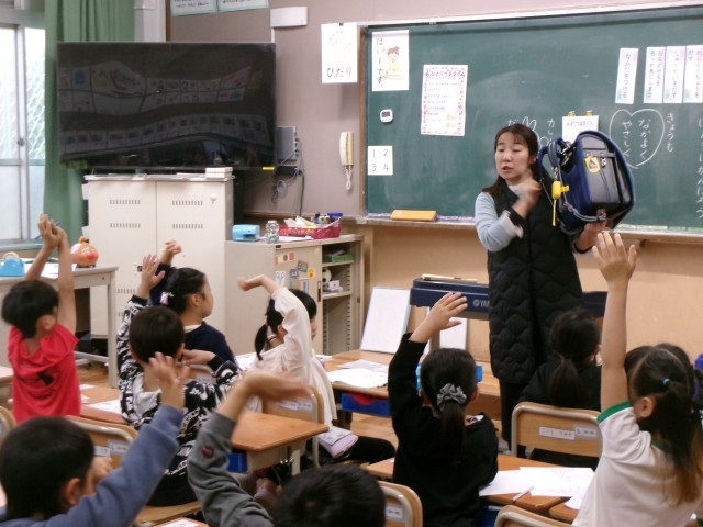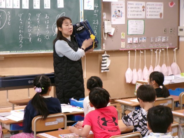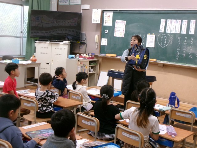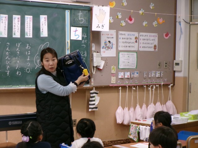1年生が先生たちと一緒に下校するのはおしまいになるので、安全について学んでいます。防犯ブザーの使い方や安全に下校するために大切なことを学びました。