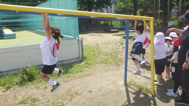 体育の「ゆうぐあそび」では、総合遊具とうんていをしました。