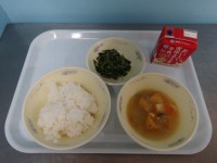 今日の献立は麦ごはん、牛乳、チキンカレー、ひじきのソテーでした。チキンカレーはチ...