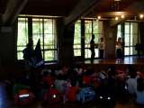 2日目の「朝のつどい」です。3校が集まり、それぞれの学校紹介をしました。
