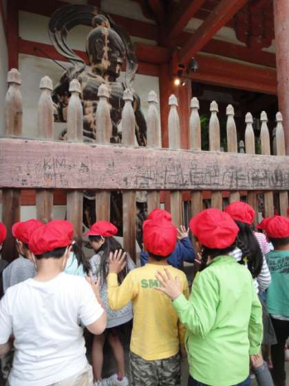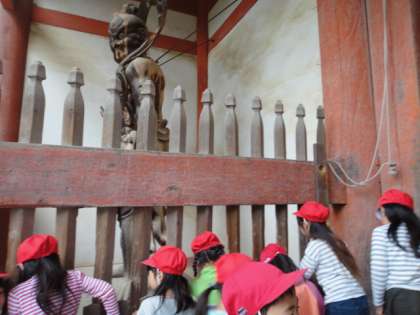 1年生は仁王さんの絵を描くために醍醐寺へ行きました。「おおきい!!」「こわいかお!」などしっかり観察をしていました。仁王さんのポーズも上手にとっていたので