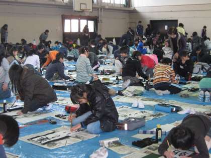 4〜6年生は,体育館で講師の高田裕苑先生をはじめ醍醐女性会のみなさんに教えていただきました。4年生は,筆で「美しい朝」を書きました。