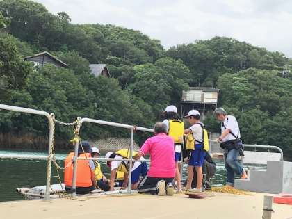 みさきの家2日目〜いかだ遊び1〜 公開日 2019/07/09 更新日 2019/07/09 4年生 午後からのストーンペイントの裏活動は、楽しみにしていた「いかだ遊び」。 ライフジャケットをつけてワクワクしながらスタートです。