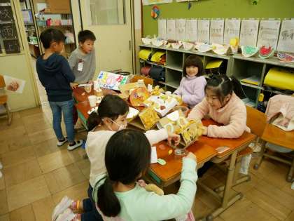 1年 秋冬まつり 公開日 2019/12/18 更新日 2019/12/18 1年生 今日の3・4時間目に2年生と秋まつりをしました。 見つけてきた秋のものを使ったおもちゃやゲームを作り,2年生に来てもらいました。 また,2年生の作ったゲームコーナーにも招待してもらい,たくさん遊んで景品ももらったようです。 素敵な秋の思い出ができました。