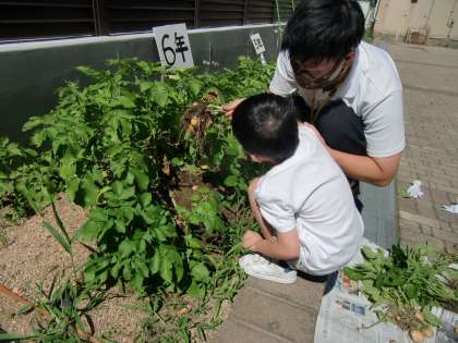 ウオーミングアップ期間の2週目。6年理科で育てていたジャガイモを,「収穫してもいいよ」と言っていただいて,みんなでジャガイモ掘りを経験しました。掘ったら,根っこのところにごろごろ可愛いおいもが育っていて,掘るのが楽しくなった子どもたちです。収穫したジャガイモをみんなで持ち帰ることができました。おいしいジャガイモ料理ができるかな・・・