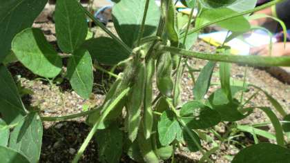 ホウセンカには赤い花が咲き,ダイズにもまめができてきました。ひまわりも大きなつぼみができています。