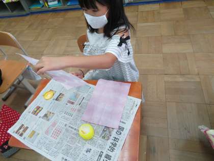 みんなが育てたあさがおの花で和紙を染めてうちわを作りました。