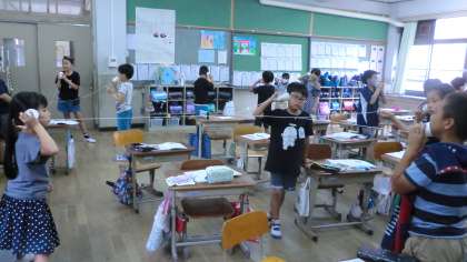 音のふしぎの学習で,糸電話をしました。小さい声でもちゃんと相手の声が伝わってきました。「音は糸を通って聞こえている!」「糸がふるえている!」と気づいたことを出し合い,翌日に振動を確かめる実験をしました。糸に通したスパンコールの動きは小さくて注意深く見る必要がありましたが,糸電話で話しているときには振動があり,話すのをやめると振動は止まることを確認できました。