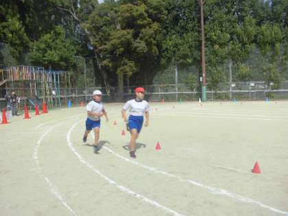 5年生のリレーでは,ねらい1とねらい2でそれぞれのめあてに向かってチームで頑張りました。ねらい1では,オーダー(走順)を工夫し,一番早く走れる走順を考えました。ねらい2では,早くバトン渡しができるようにチームで練習しました。