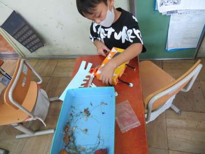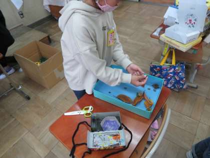 図工の学習で,入れるものに合わせて,箱を飾りました。