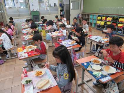 準備も片付けも覚えることがいっぱいですが,おいしい給食に笑顔があふれていました。