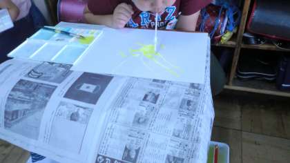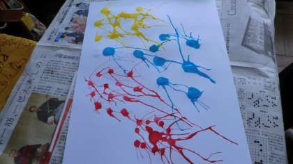 偶然の模様を楽しもう,と様々な技法を使って楽しみました。スパッタリングは絵の具の濃さによって色の出方が全然違ったり,ビー玉を使って模様を描くと思いもよらない面白い線が描けたり・・・とそれぞれの特徴を生かした活動となりました。