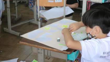 先週作った偶然の模様を切り貼りしてコラージュ作品を作っています。適当に切って何に見えるか考えている人や,〇〇を作ろう!と決めて貼り合わせている人,様々ですが,出来た模様のどの部分を切り取るか,どのように組み合わせるかで,見えてくるものが全然違います。面白い作品が出来そうで,楽しみです。