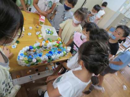 図工の学習で,身の回りにあるものをたくさん使って並べたり積んだりして遊びました。箱やコップ,ペットボトルを使ってアイデアを膨らまし,楽しみました。子どもたちのはじける笑顔がたくさん見られました。