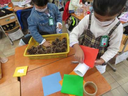 生活の「あきといっしょに」の学習で,秋に見つけたものを使ってあきまつりの準備をしました。学校や端山公園で見つけたものを使って,どんなものを作りたいか考え,友だちと協力しながら学習を進めています。どうすればうまくいくか相談しながら作ることが楽しいです。