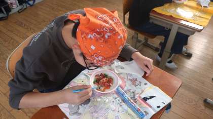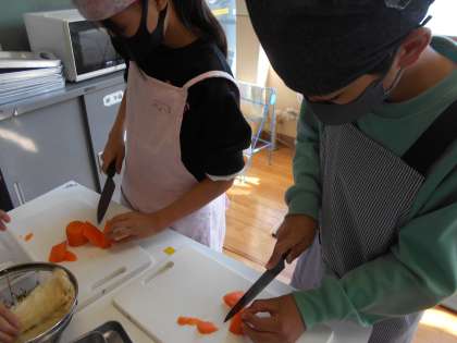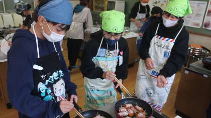 「まかせてね 今日の食事」の学習で,栄養バランスのとれた食事の献立を考えたり作ったりする学習をしています。昨日と今日は調理実習で,ベーコン巻きを作りました。にんじん,えのき,いんげんをベーコンで巻き,炒めました。調理の間に,片付けられるものから片付けるなど,手際よくできている班がありました。この経験を生かして,家庭でも調理に興味を持ち,実践してほしいです。