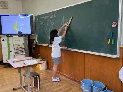 算数では,線対称と点対称の学習をしています。線対称の図形の次は,点対称の図形です。どのようにしたらかくことができるのか,いろいろな方法で考えていました。
