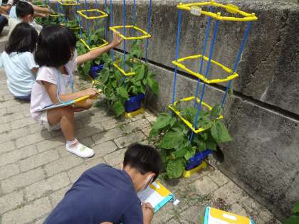 【1年】 つるがのびたよ! 公開日 2022/06/15 更新日 2022/06/15 学校の様子 あさがおの葉もたくさん増え,つるが伸びてくるようになりました。 「つるがびよーんってなってるね!」 「葉っぱがいっぱいあり過ぎて,数えるのが大変!」と言いながら,熱心に観察していました。