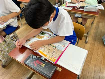 社会の学習で、教科書や資料集をしっかりと読み、調べている様子です。