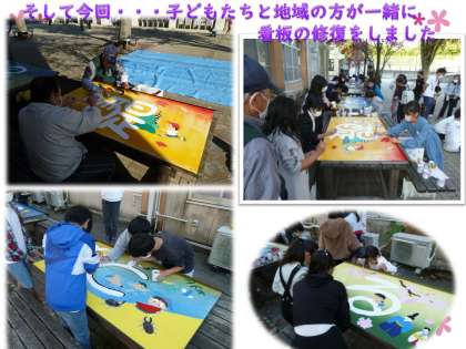 今回、子どもたちと地域の方と一緒に看板を修復しました。