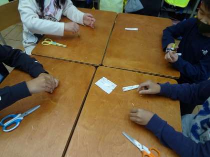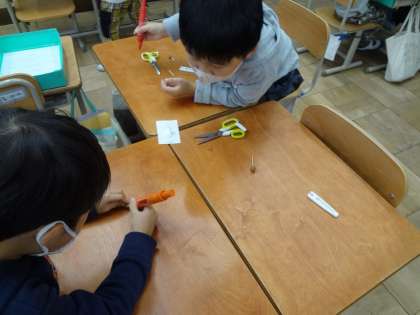 生活科の「あきといっしょに」の学習で、秋のものを使ったおもちゃ作りとして、どんぐりごまを作りました。「すごくクルクル回ったよ!」「お顔を描いて、かわいくしたよ!」など話しながら、秋を感じながら楽しく遊ぶことができました。