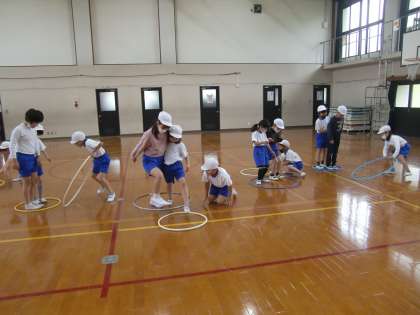 今日はフラフープを使ってペアやグループで協力しながらすすめました。