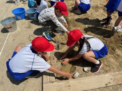 今日の図工の学習は、運動所の砂場で行いました。